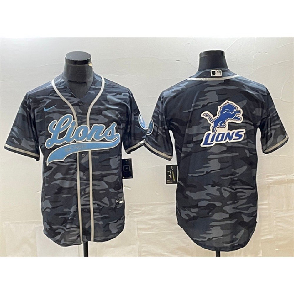 Men’s Detroit Lions Grey Camo Team Big Logo Cool Base Stitched Baseball Jersey