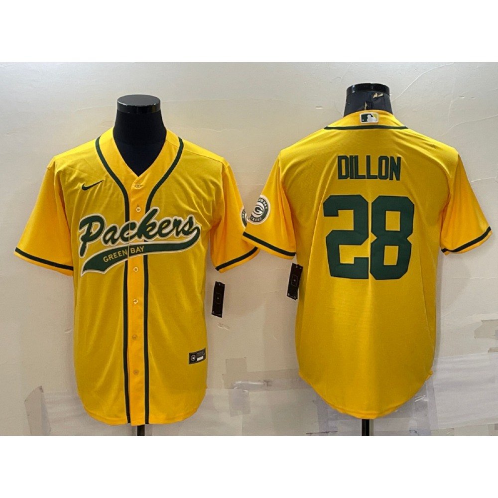 Men’s Green Bay Packers #28 A.J. Dillon Gold With Patch Cool Base Stitched Baseball Jersey